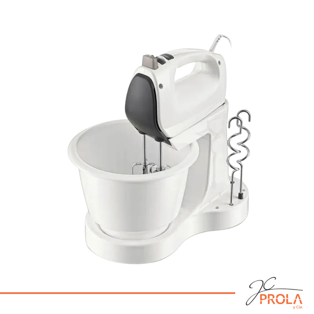 Batidora de pie con potente motor de 400 W que puede incluso manipular masa de pan. 5 velocidades y función turbo para el ajuste que prefiera. Batidores, ganchos para masa. Recipiente de 3,5 L. Color blanco.