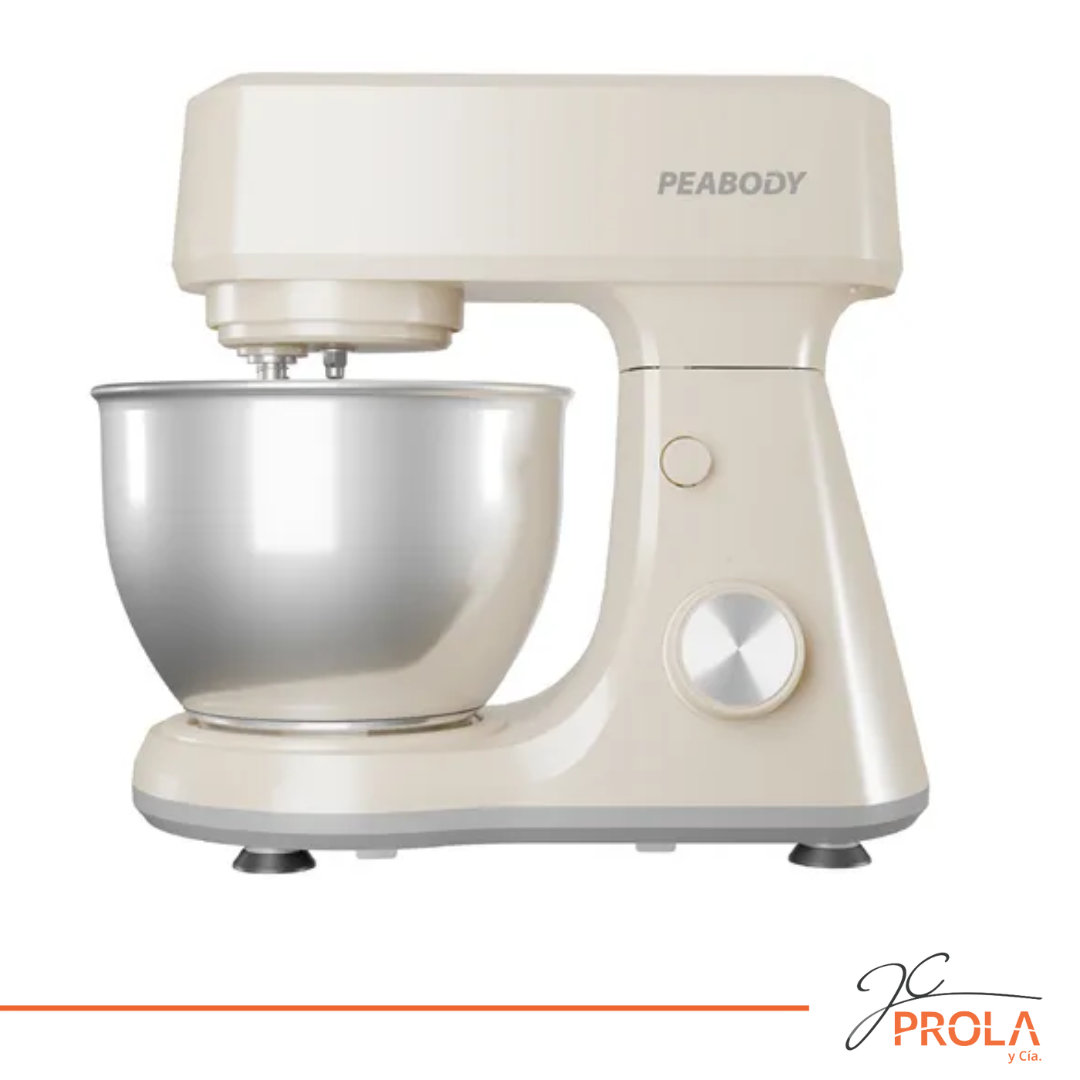 Batidora Peabody. Potente motor de 400W. 5 niveles de velocidad más función turbo. Bowl de acero inoxidable con capacidad de 3,5 litros. Batidores y amasadores metálicos de alta resistencia. Cabezal inclinable que facilita el retiro del bowl. Base antideslizante para mayor estabilidad durante el uso.
