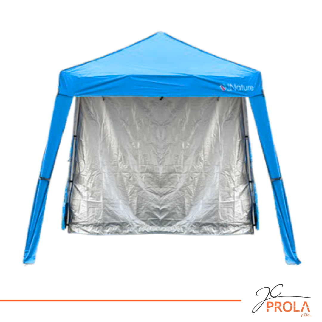TELA ALUMINAZADA CON PROTECCION UV. ESTRUCTURA DE HIERRO PINTADA EN EPOXI. PATAS TELESCOPICAS. 3 POSICIONES. INCLUYE 2 PAREDES.