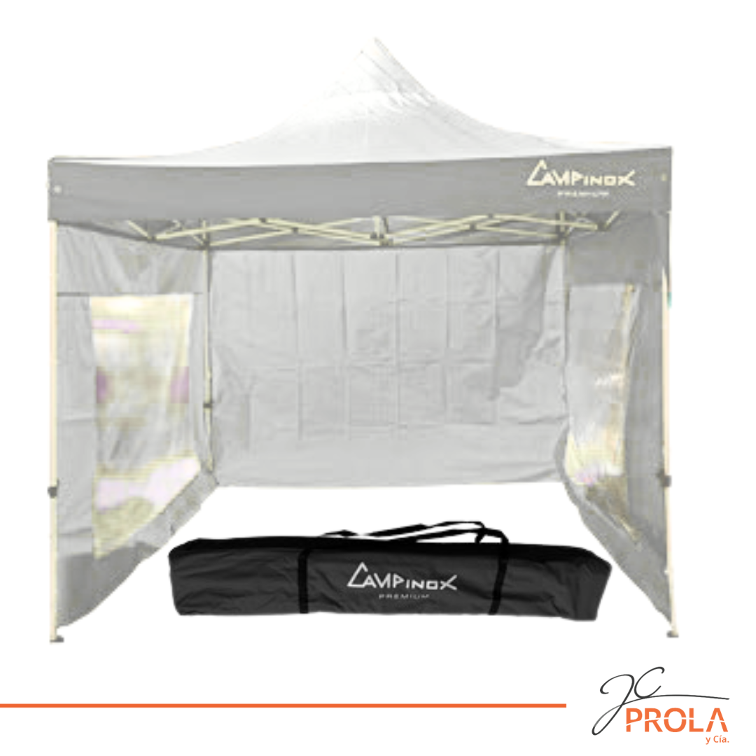 Estructura reforzada de tubos de acero de pared gruesa Techo de tela de poliéster reforzado con PVC Patas telescópicas Incluye 3 paredes desmontables Varillas de 6mm para paredes y patas.