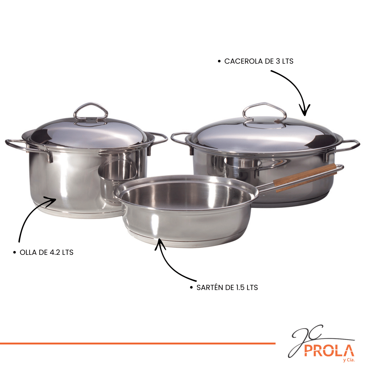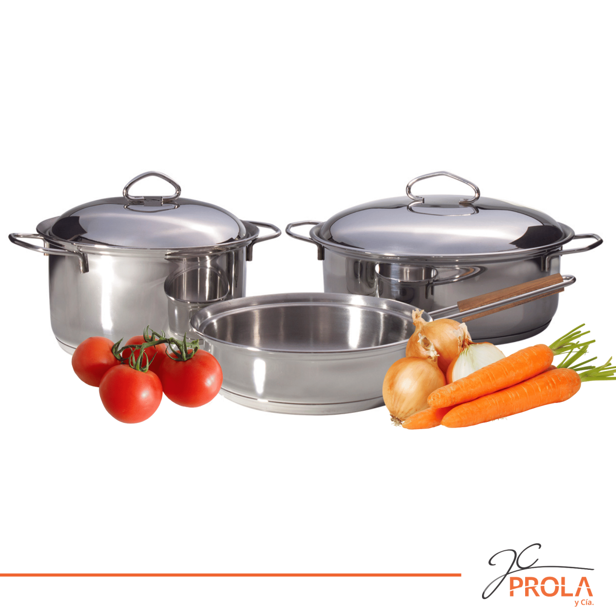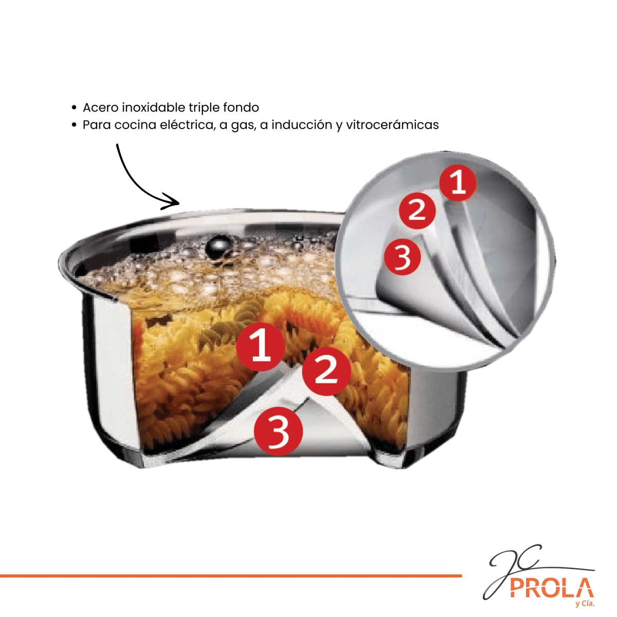 Batería de cocina acero inoxidable triple fondo (acero inoxidable + aluminio + acero inoxidablede) 5 piezas. Incluye: 1 cacerola de 4.2lts ,1 cacerola de 3lts, 1 sartén de 1.5lts, 2 tapas. Distribuye el calor de manera uniforme y proporciona una cocción más rápida. Ahorra energía y mantiene los alimentos calientes durante más tiempo. Para cocina eléctricas, a gas, a inducción y vitrocerámicas.