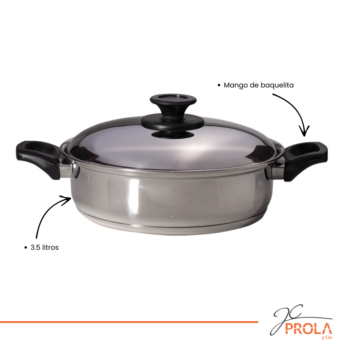 Paelleraacero inoxidable con triple fondo (aceroinoxidable+aluminio+aceroinoxidable) de3.5ltsconasasdebaquelita.Distribuyeelcalordemanerauniformeyproporcionaunacocciónmásrápida.Ahorraenergíaymantienelosalimentoscalientesdurantemástiempo.Paracocinaseléctricas,agas,ainducciónyvitrocerámicas.