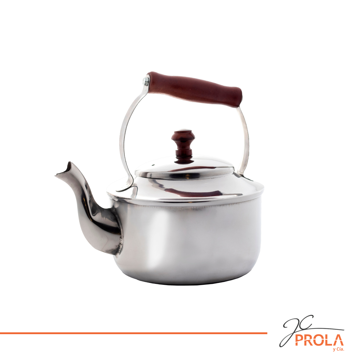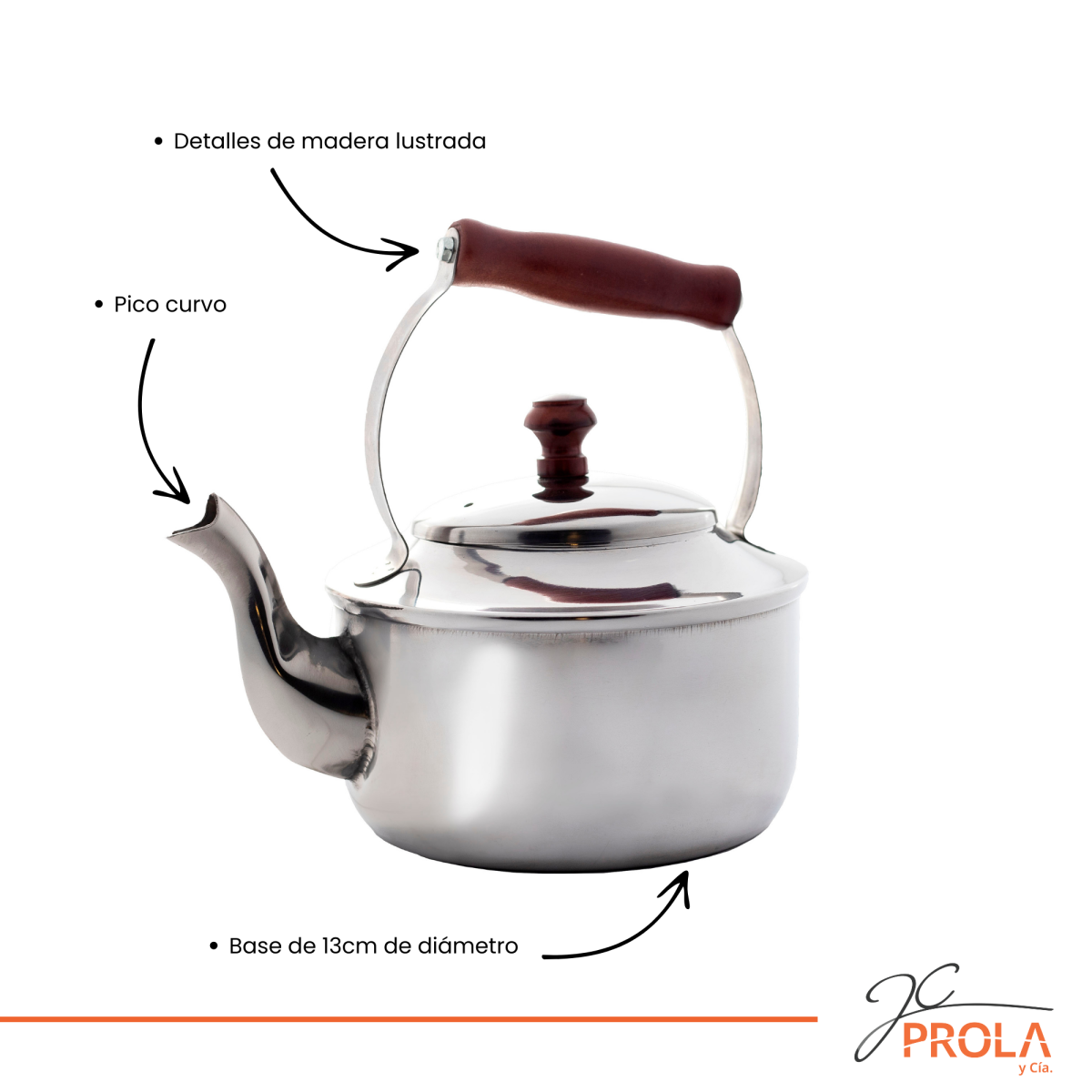 Pava para fogón Eco con pico curvo de 1.4lts con detalles de madera lustrada en mango. Base de 13cm de diámetro. Acero 304-