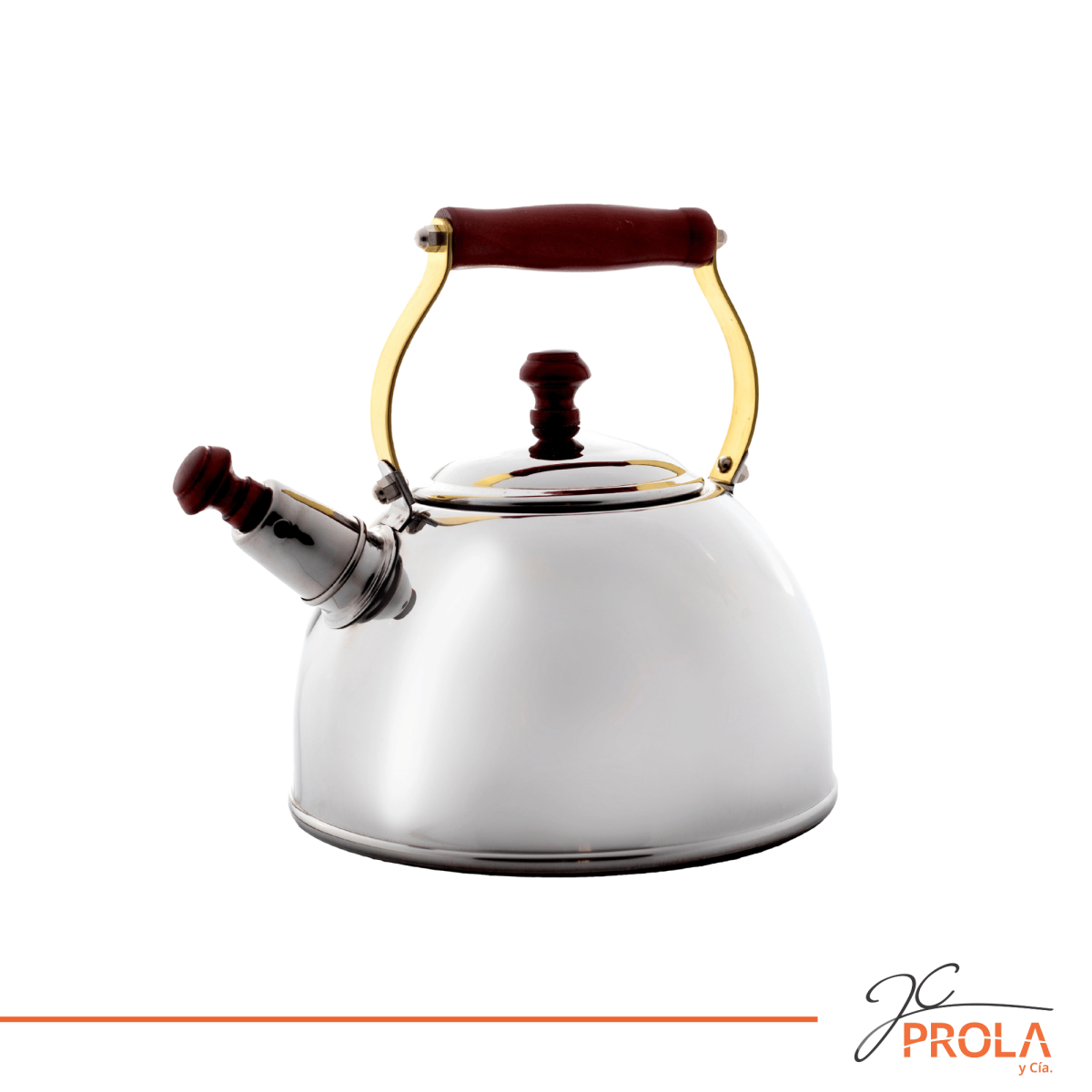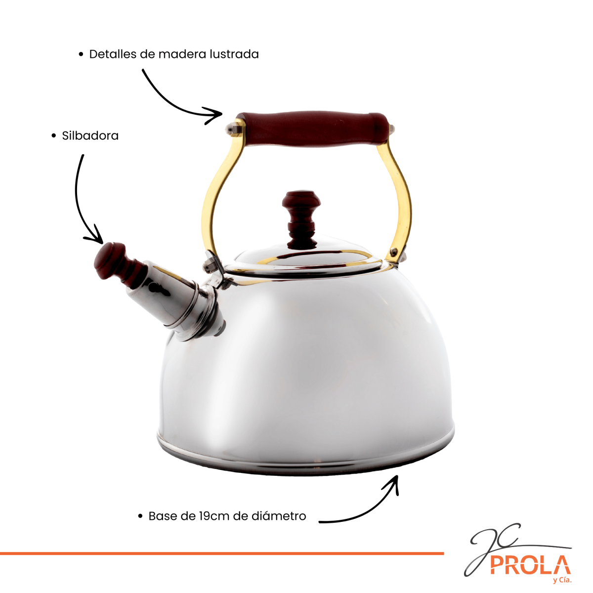Pava para fogón silbadora de 2.2lts con detalles de madera lustrada en mango y pico. Base de 19cm de diámetro. Acero inoxidable.