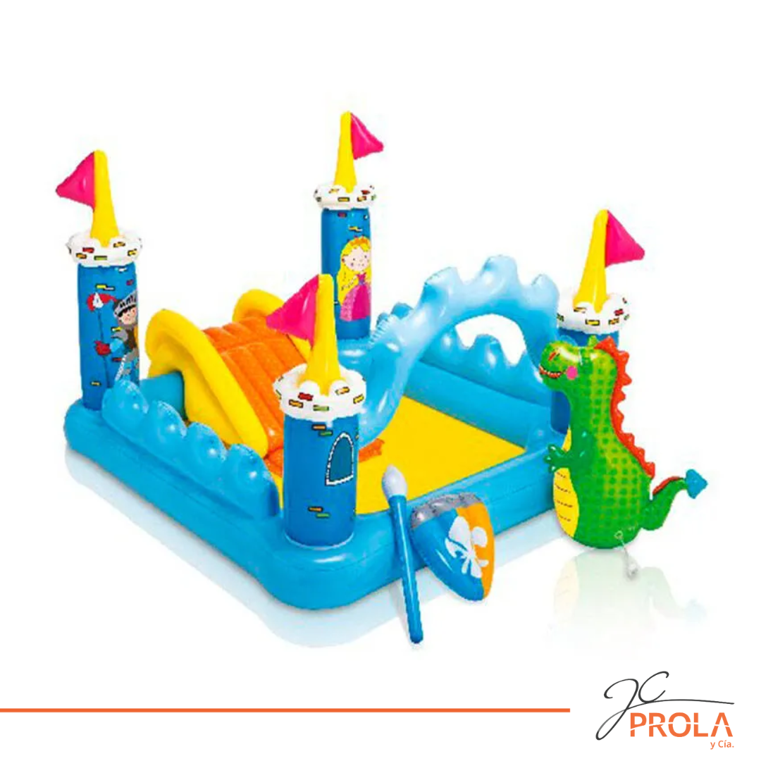 Centro de juegos inflable Intex Castillo. Medidas 185x152x107 cm y capacidad para 178 litros/agua. Incluye Dragon inflable el cual se conecta a una manguera y dispersa el agua, cuenta ademas con una lanza y escudo inflable. Fabricado con vinilo resistente, incluye tapon de drenaje para un facil llenado y vaciado y Kit de parches para reparar pequeños poros o pinchazos.