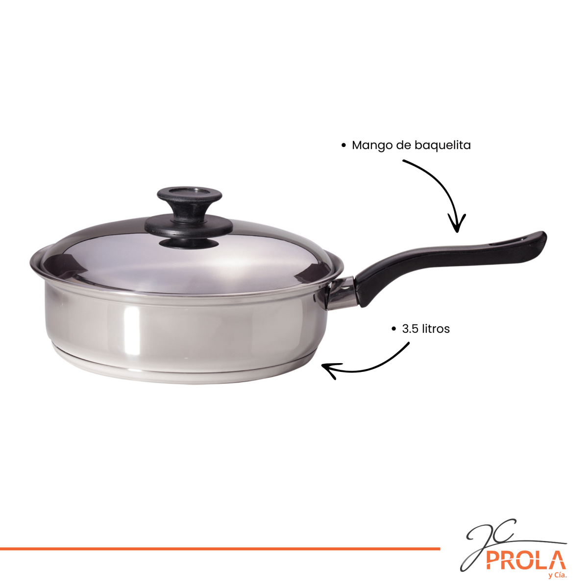 Sartén de 3,5 lts con mango de baquelita. De acero inoxidable muy durable con triple fondo (acero inoxidable + aluminio + acero inoxidable). Distribuye el calor de manera uniforme y proporciona una cocción más rápida. Ahorra energía y mantiene los alimentos calientes durante más tiempo. Para cocinas eléctricas, a gas, a inducción y vitrocerámicas.
