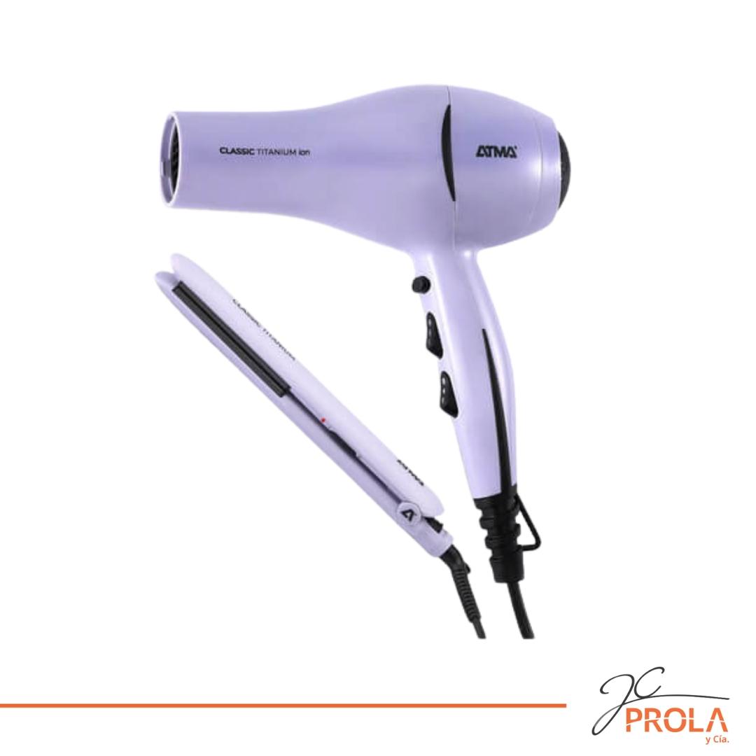 TITANIUM BEAUTY SET - COMBO SECADOR + PLANCHITA DE PELO. Secador ionico 1800W de potencia. Boquilla concentradora. Botón aire frio. Planchita 230°C temp max. Placas de titanio. Cable giratorio.