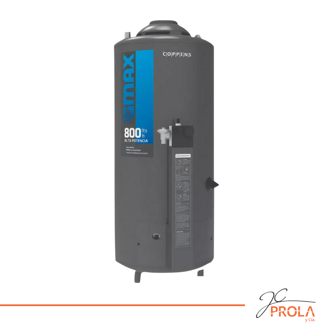 Termotanque a gas natural 50 lts. Alta recuperación = 800 lts en una hora. Conexión superior. Sistema de calentamiento multitubular (4 caños de 3"). Encendido piezoeléctrico. Sensor de sálida de gases. Válvula de seguridad. Regulador de presión.