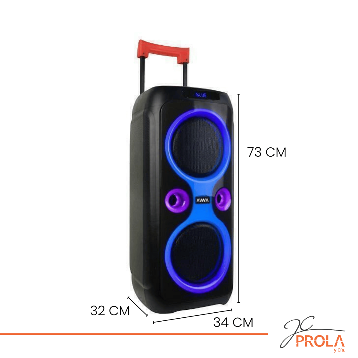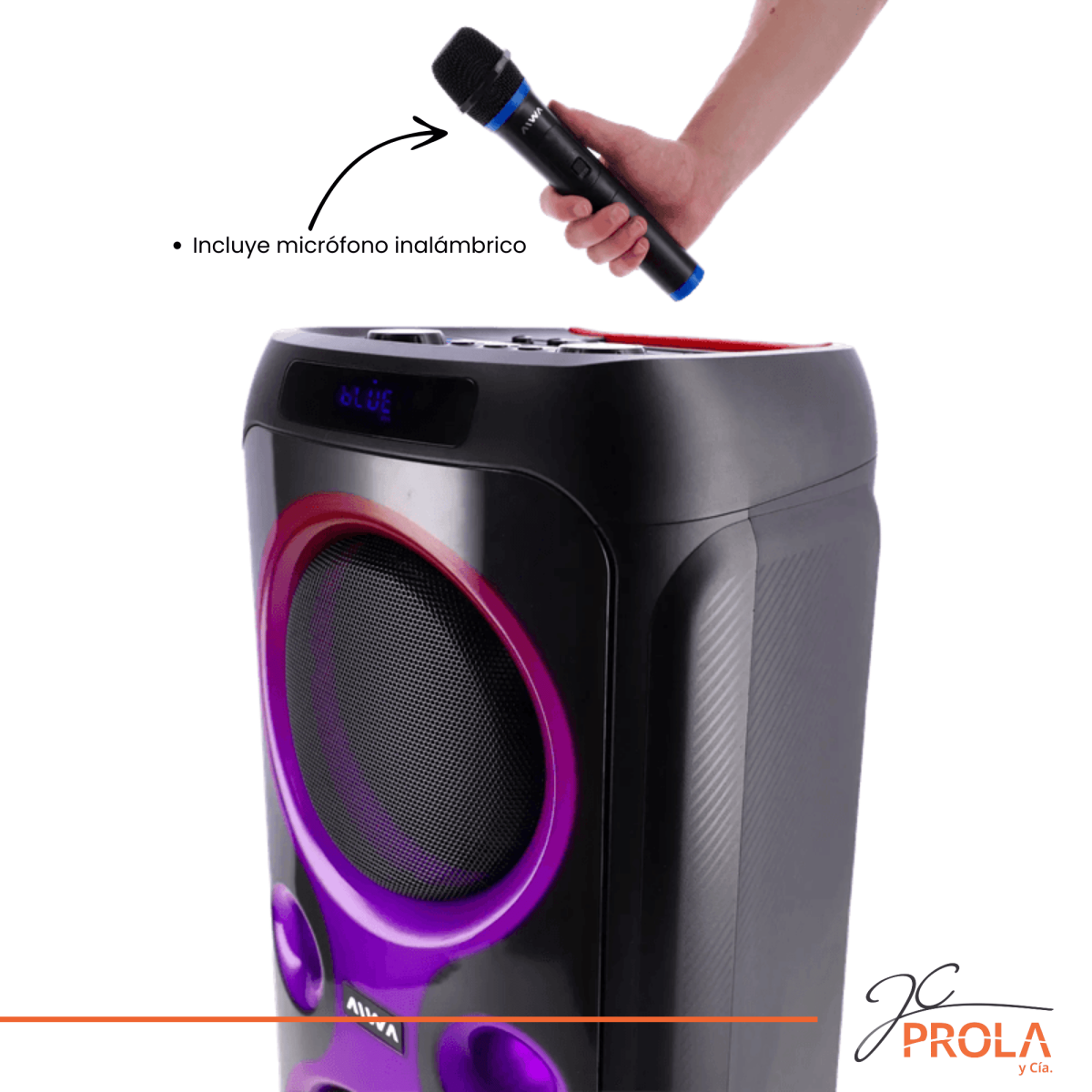 Torre de audio bluetooth. Potencia 12500W PMPO. 2 woofers x 10". Entradas auxiliar/micrófono/guitarra. Función TWS (conexión inalámbrica entre 2 parlantes del mismo modelo). Función Power Bank. Cuenta con manija extensible y ruedas. Incluye micrófono inalámbrico/cable auxiliar/fuente de alimentación. Medidas: 34x73x32. Peso 13kg.