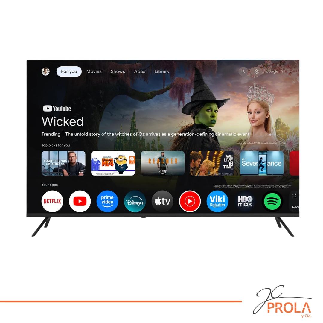 Android TV con pantalla LED de 60" (1,33 m x 75 cm), resolución 4K, Smart TV con aplicaciones integradas como YouTube, conectividad Wi-Fi, puerto de red (Ethernet) y Bluetooth, y puertos HDMI y USB.