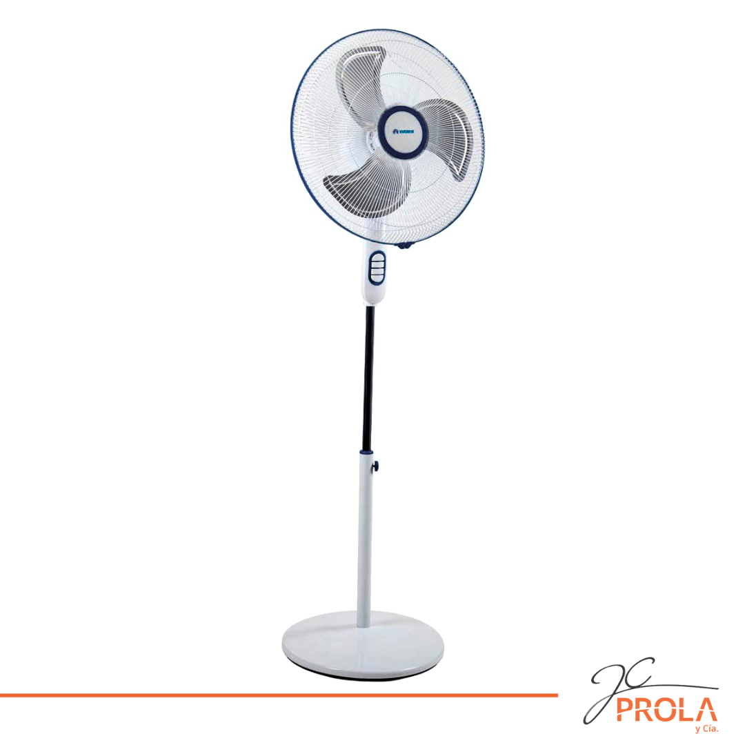 Ventilador de pie 20". Pala de aluminio de 3 aspas. 95W. Altura 175m. Rejilla de 152 grillas. Control a botonera, botellón curvo, base volante con contrapeso, motor 75x25mm. Color blanco y azul. Embalaje por 6 unidades.