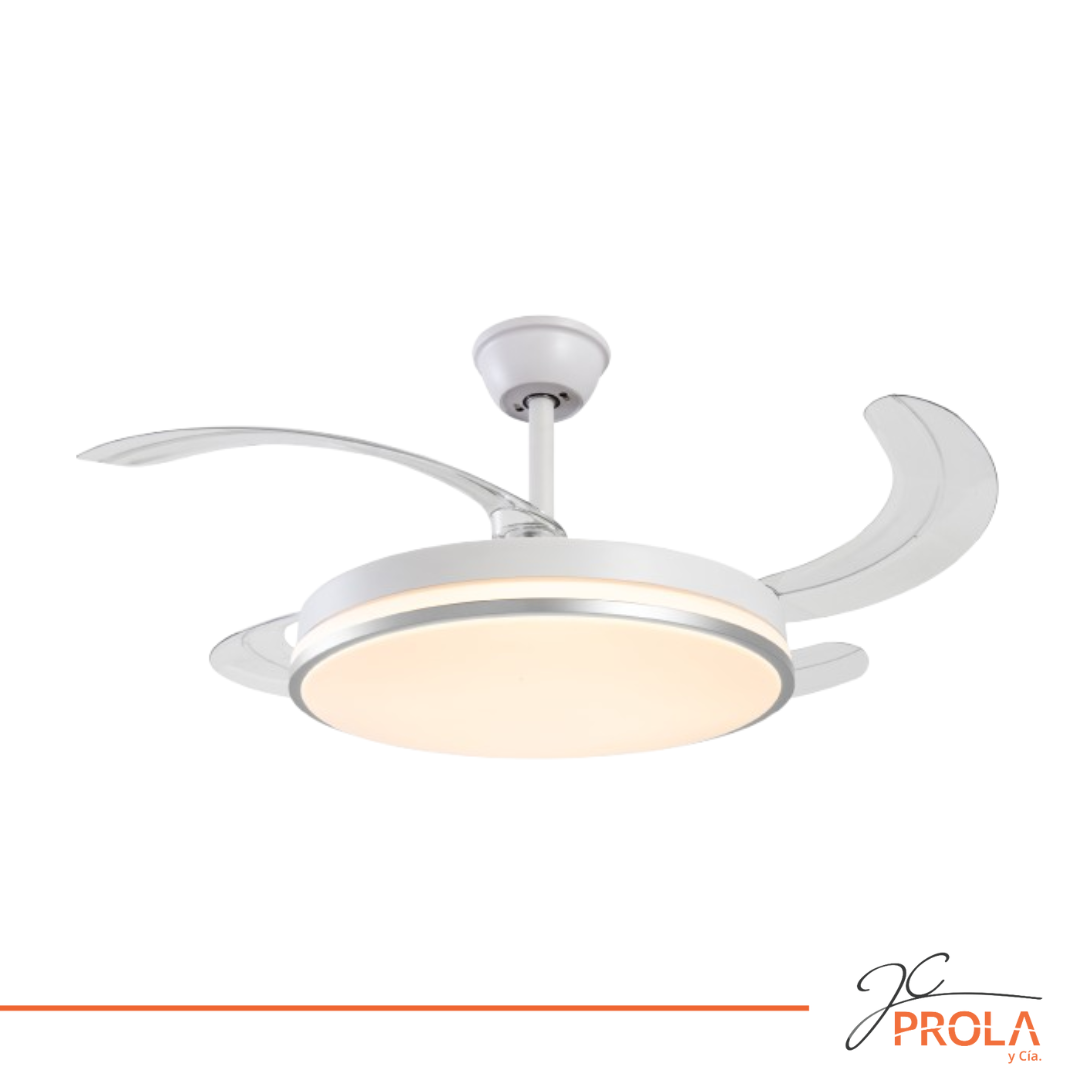 Ventilador retráctil. 4 palas de acrílico retráctil. Diámetro extendido de palas: 107cm. Diámetro con palas retraídas 50cm. 6 velocidades. Motor bajo consumo DC de 50W. Muy bajo nivel de ruido. Potencia luz led de 35W. Luz led en tres tonos: fría, cálida y neutra. Incluye control remoto. Timer. Función reversa invierno / verano.
