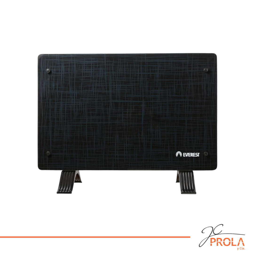 Vitrocalefactor con forzador. Panel de vidrio templado. Termostato regulable de 0 a 2000W. 3 niveles de potencia 750 / 1250 / 2000. Protector térmico por sobrecalentamiento - Corte automático por vuelco. Color negro.